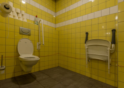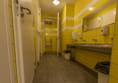 Moderne ruimte met 1 mindervalide toilet en douche, 3 toiletten, een wastrog met 5 kranen. ± 15m²